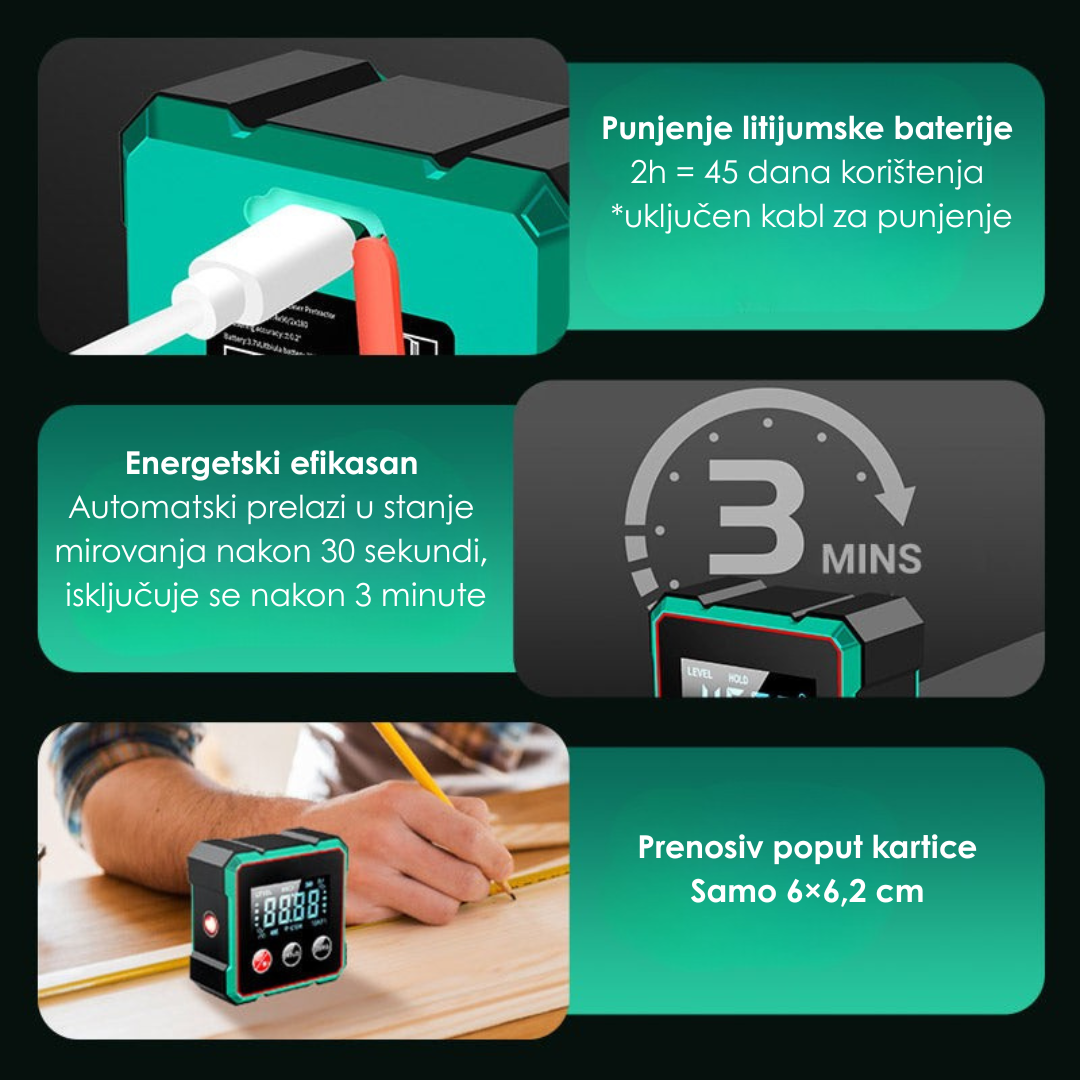 Ovaj precizni alat pruža magnetsku stabilnost na četiri strane i dvostrani laserski zrak za tačna mjerenja. Prozirni LCD zaslon omogućava jasan pregled čak i u slabom svjetlu. Sa mogućnošću mjerenja kuta i nagiba te zadržavanjem podataka, idealan je za različite profesionalne i kućne zadatke.