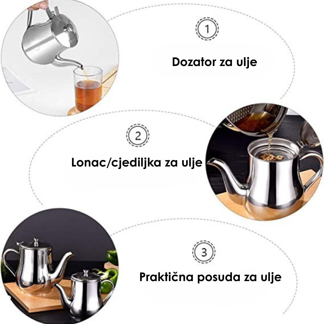 Poklopac štiti od prašine i osigurava higijenu. Ergonomska drška omogućava lako i sigurno držanje bez opasnosti od opekotina. Zakrivljeni izljev pruža glatko sipanje bez kapanja, dok protuklizna baza sprečava prosipanje ulja po radnoj površini.
