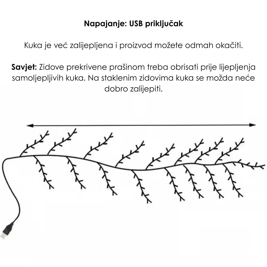Svjetleća dekoracija u obliku drveta je savitljiva i može se postaviti duž zidova, oko kreveta, ogledala ili polica. Zahvaljujući USB napajanju i dugom kablu, lako je prilagoditi prostoru. Bez bušenja i komplikacija – samo kreativnost i sjaj.